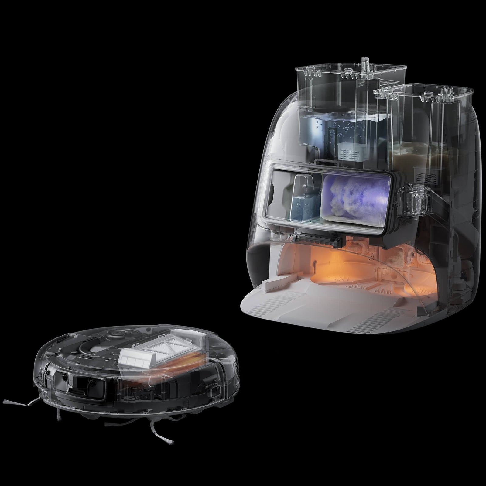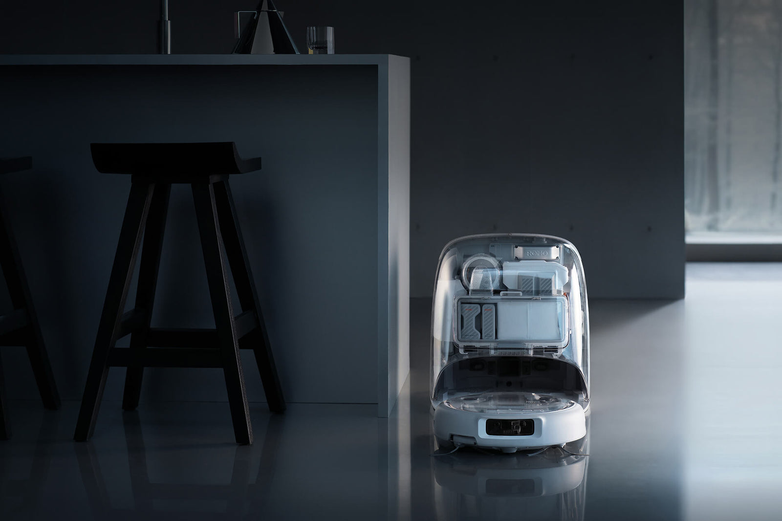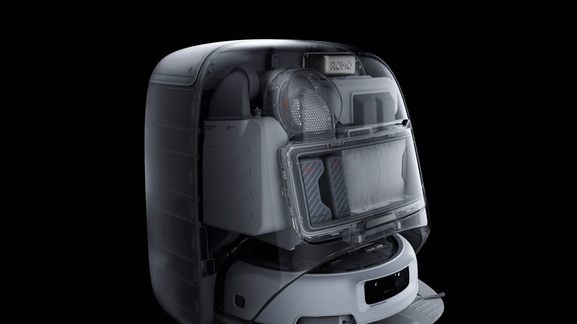 It features transparent panels on both the base station and robot, proudly revealing the meticulously organized internal components. In your most cherished space, it showcases a timeless aesthetic that transcends eras.