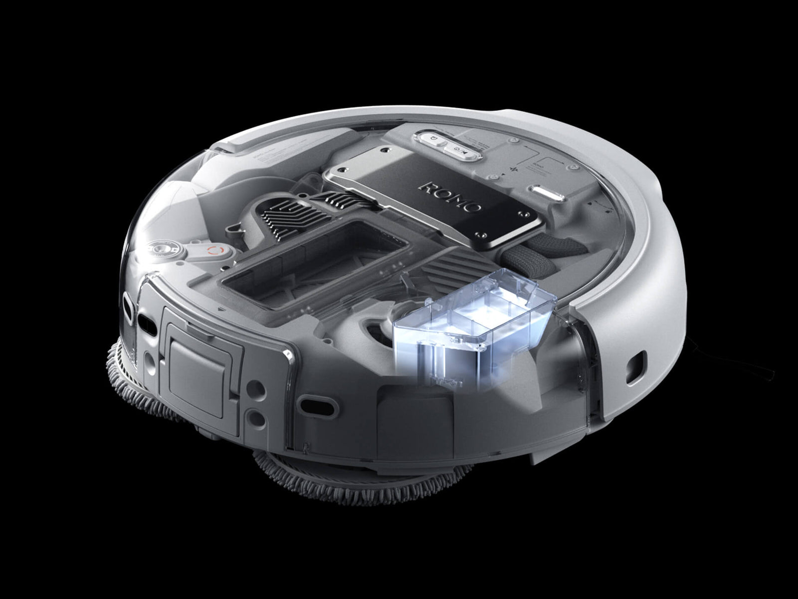 Adapting to each task, ROMO P lifts its roller brush or mop pads accordingly to avoid cross‑contamination.