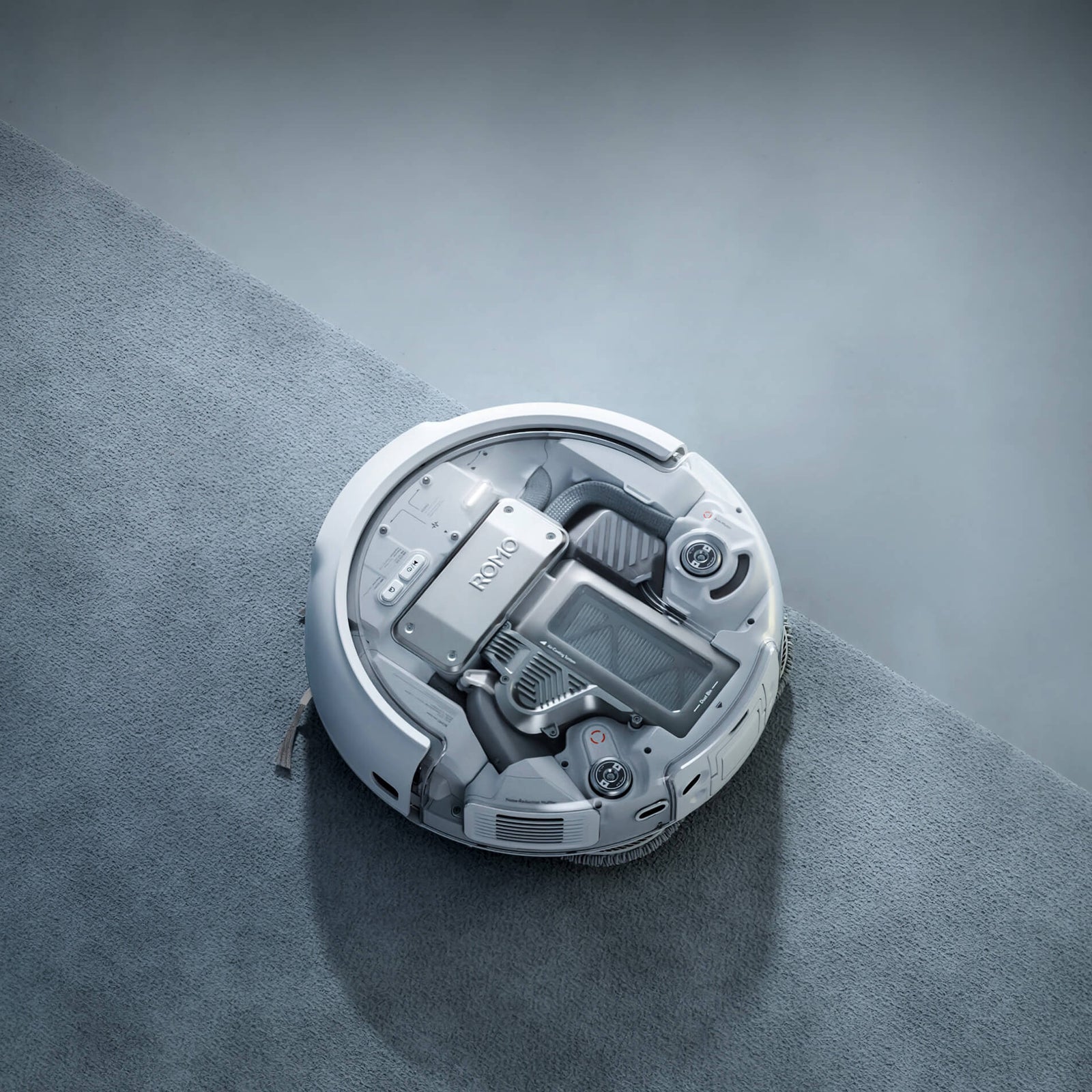 In mop-only mode, ROMO P lifts the roller brush to avoid cross-contamination, and during dust collection, it also lifts it to keep noise to a minimum.