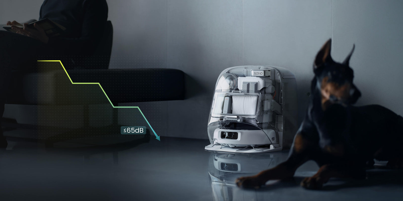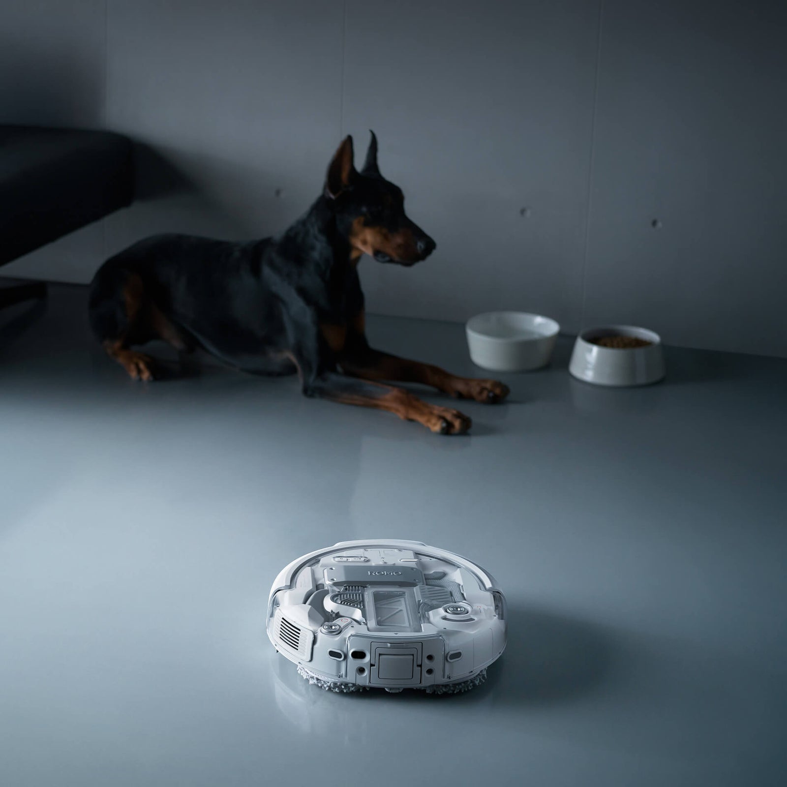 ROMO P combines input from multiple sensors for deep environmental awareness, navigating confidently under beds or sofas in low light and handling black objects with ease.