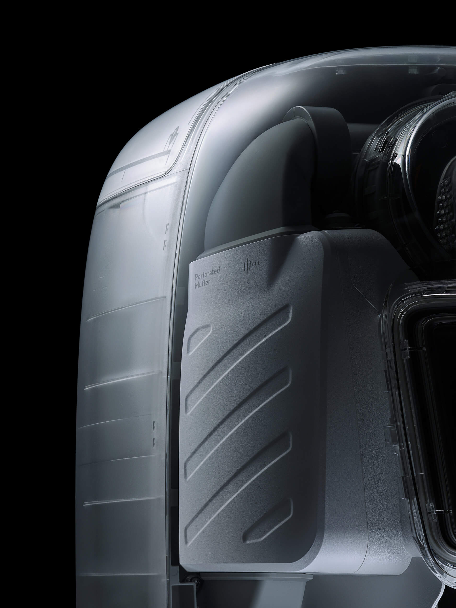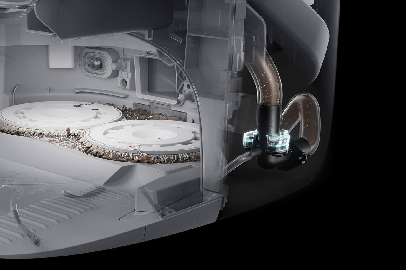 The base station washboard features a neat design to prevent dirt buildup and make cleaning easier. With high-pressure water jets and a large-diameter waste outlet, it thoroughly washes the mop pads and flushes away debris via the large waste suction port.