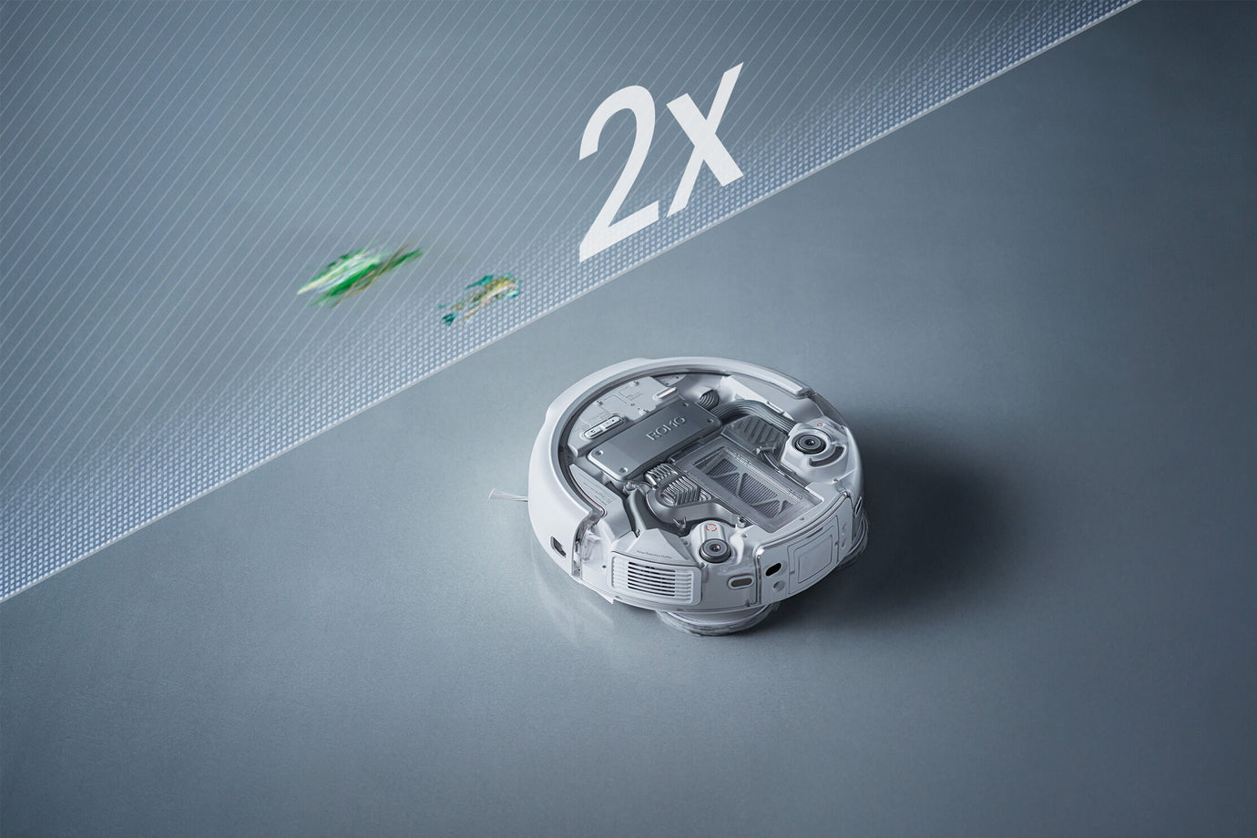 Spotting debris like cat litter with its fisheye vision sensors, ROMO P automatically eases its speed and side brush rotation to prevent scatter, then boosts suction for an exceptional clean.